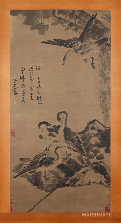 題跋:筆墨質樸蒼渾,意境荒涼寂寞,為八大山人畫風炳標獨立一座不可逾之高峰。道光六年八月廿二日叔美錢杜並識(1764-1845)